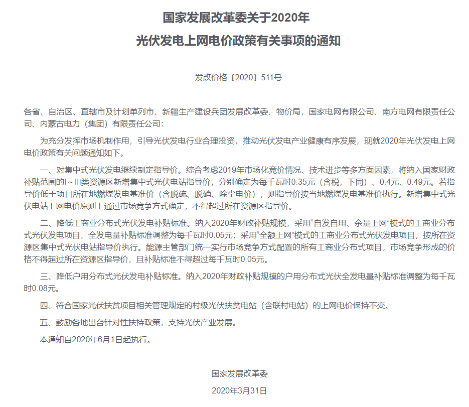 为充分发挥市场机制作用,科学合理引导新能源投资,推动光伏发电产业健康有序发展,近日,国家发展改革委印发《关于2020年光伏发电上网电价政策有关事项的通知》(以下简称《通知》),公布了2020年光伏发电上网电价政策。