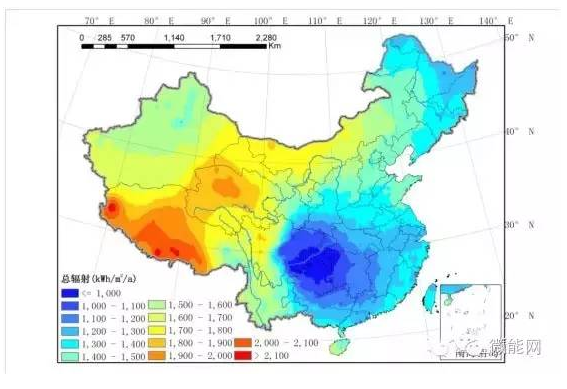 我国太阳能总辐射资源丰富,总体呈高原大于平原,西部地区大于东部地区的分布特点,其中青藏高原最为丰富,四川盆地资源相对效低。