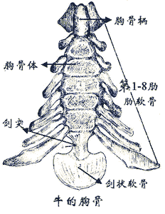 1.胸骨:由骨质的胸骨节和软骨构成。胸骨的前端称为胸骨柄,两侧有 8 对肋窝,与胸骨肋的肋软骨相接,后端的圆形软骨称剑状软骨。