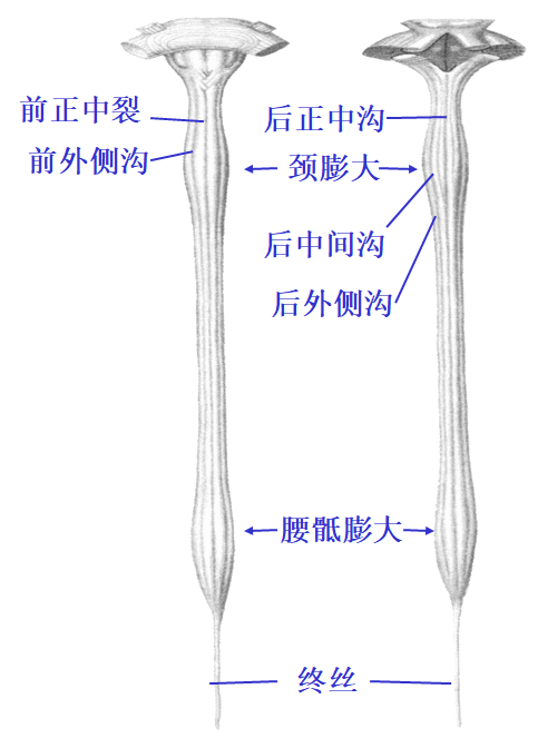 外形:脊髓呈前、后稍扁的圆柱形,全长粗细不等,有两个梭形的膨大,即颈膨大和腰骶膨大。前者自第4颈节至第1胸节,后者自第2腰节至第3骶节。这两个膨大的形成是因为内部的神经元数量相对较多,与四肢的出现有关。脊髓末端变细,称为脊髓圆锥,自此处向下延为细长的无神经组织的终丝,长约500px,向上与软脊膜相连,向下在第2骶椎水平以下由硬脊膜包裹,止于尾骨的背面。
