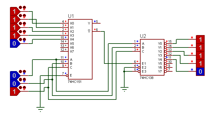 实验内容 | 1.用数据选择器74151和译码器74138组成一个5路分时传送系统。测试在相同地址A2A1A0控制下,74HC151的数据输入D4~D0和74HC138的输出Y4~Y0的对应关系。 2.用加法器7483和异或门74386组成一个4位二进制数加法/减法器,并用实验的方法检测其逻辑功能。 |