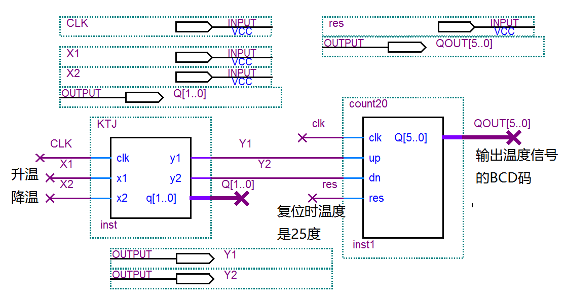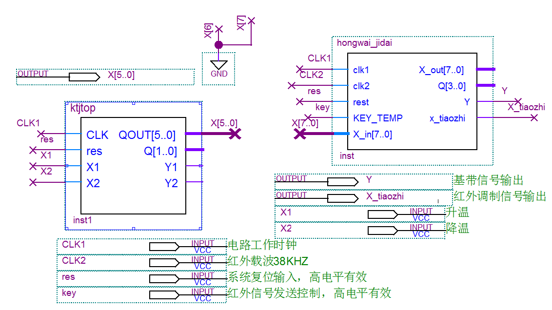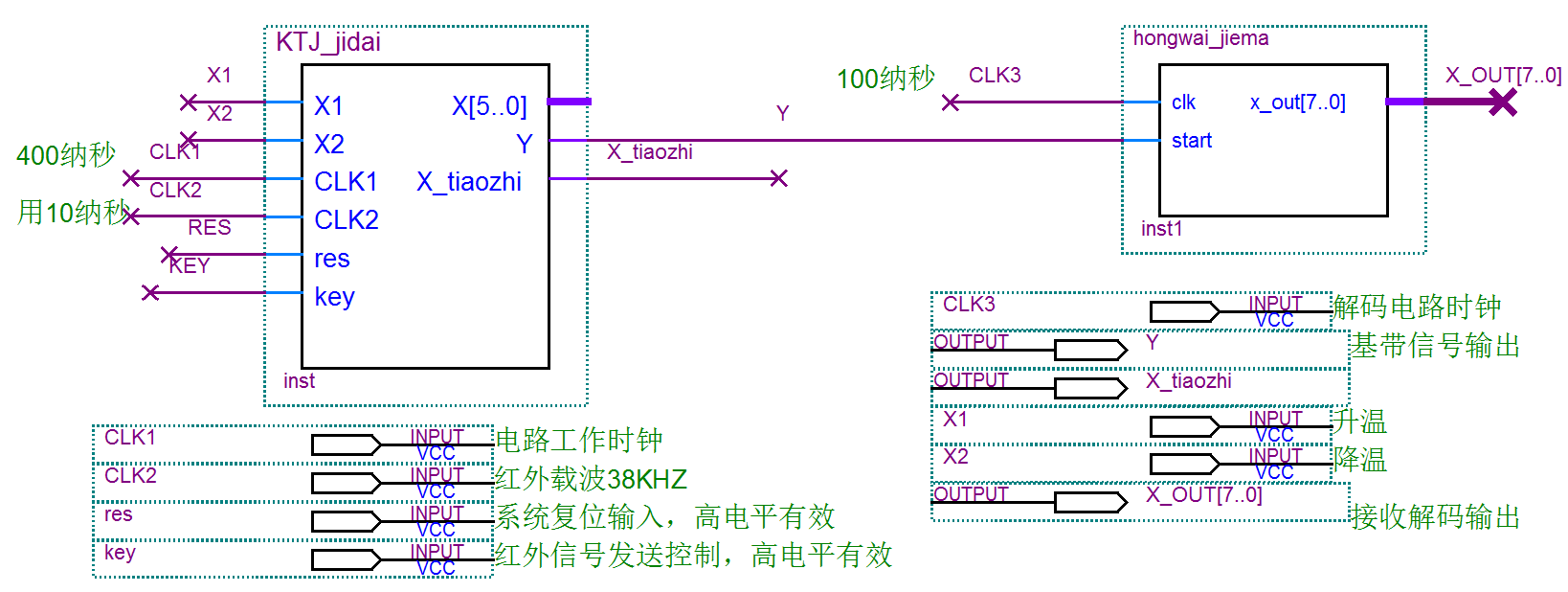 四、把总电路中的KTJ_jidai和hongwai_jiemal(增加2只7447译码电路)两个电路,分别下载到两块DE2中,用杜邦线连接图中Y的基带通信线路,同时两块DE2共地,调试基带通信的正确性。