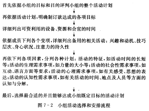 (10)小组决策。该类活动的设计主要是在引导成员如何群策群力、共同解决小组的问题,其探讨的主题,主要以与小组合作、小组思考、小组讨论、小组竞赛等方面有关的训练活动为主除了上述类型外,还有一些活动,如:接触活动、经验性活动、信任活动以及创造性道具使用活动,等等,都可以供我们在开展老年小组工作时酌情采纳。当然,这里的“酌情”十分重要。换而言之,活动的安排一定要考虑其适切性以及天、地、时、事、物等主客观影响因素通常情况下,为了使老年小组工作能更好地达成目标,所选择的小组活动可以依据以下的流程来进行,见图7-2。