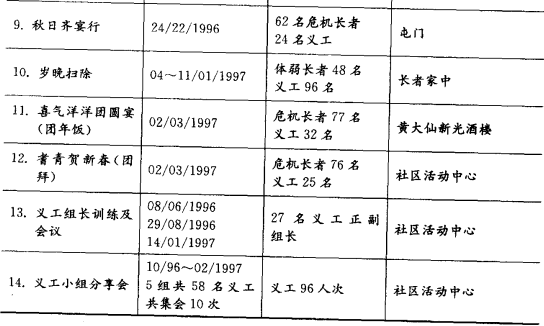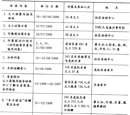 (2)具体在策略是借助建立义工网络联系义工和区内危机长者,建立关怀关系,主动提供适当的帮助或介绍适切的社区资源。