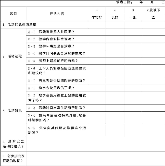 3)满意度调查表既包括总体印象也包括对具体的细节的印象4)分值评价和描述性评价相结合;评价与建议相结合
