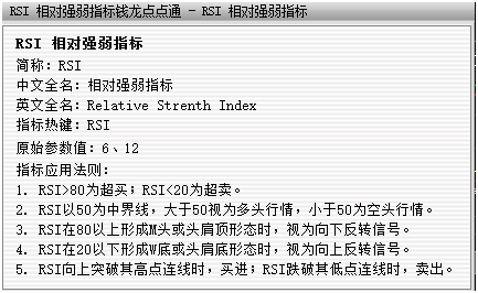 相对强弱指数RSI是根据一定时期内上涨点数和下跌点数之和的比率制作出的一种技术曲线。能够反映出市场在一定时期内的景气程度。由威尔斯.威尔德(Welles Wilder)最早应用于期货买卖,后来人们发现在众多的图表技术分析中,强弱指标的理论和实践极其适合于股票市场的短线投资,于是被用于股票升跌的测量和分析中。该分析指标的设计是以三条线来反映价格走势的强弱,这种图形可以为投资者提供操作依据,非常适合做短线差价操作。