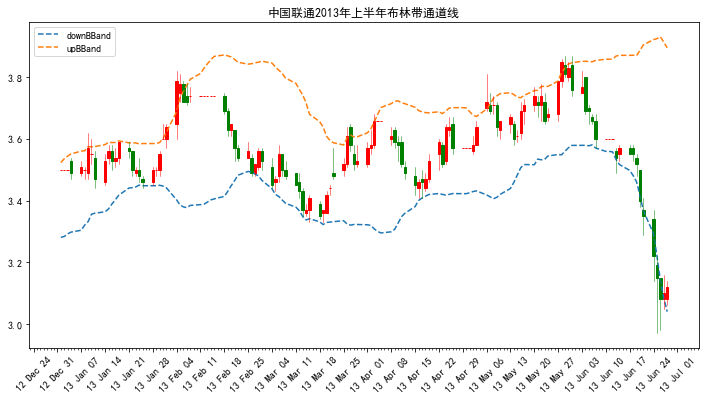 candle.candleLinePlots(candleData=ChinaUnicom13,candleTitle=title,Data=upDownBB13)