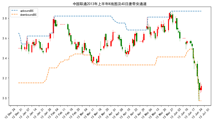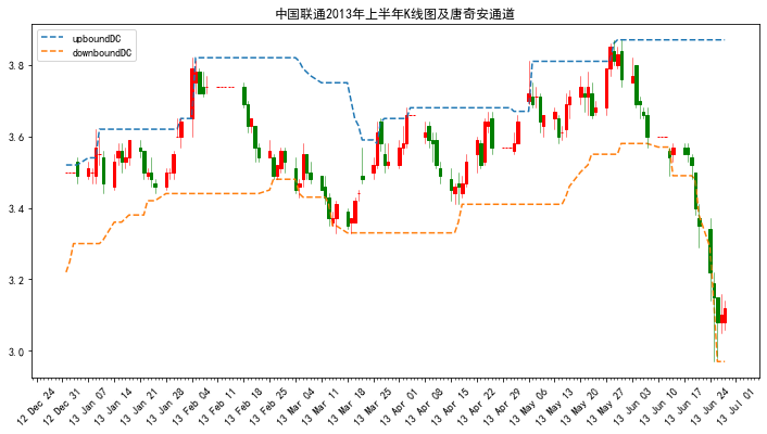 # 绘制2013年上半年中国联通价格的K线图及唐奇安通道
