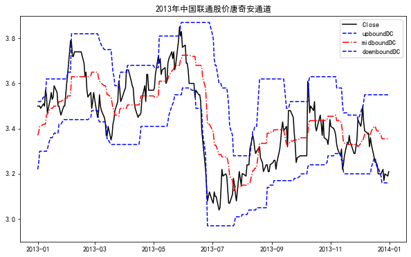 # 绘制2013年中国联通价格的唐奇安上中下通道