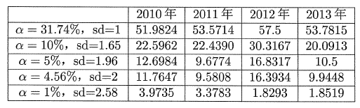 # 定义布林带风险函数 def CalBollRisk(tsPrice,multiplier): k = len(multiplier) overUp = [] belowDown = [] BollRisk = [] for i in range(k): BBands = bbands(tsPrice,20,multiplier[i]) a = 0 b = 0 for j in range(len(BBands)): tsPrice = tsPrice[-(len(BBands)):] if tsPrice[j] > BBands.upBBand[j]: a += 1 elif tsPrice[j] < BBands.downBBand[j]: b += 1 overUp.append(a) belowDown.append(b) BollRisk.append(100*(a+b) / len(tsPrice)) return(BollRisk) # 设定标准差的倍数向量 multiplier = [1,1.65,1.96,2,2.58] # 计算不同年份的布林带风险:2010年 price2010 = Close['2010-01-04':'2010-12-31'] CalBollRisk(price2010,multiplier) # 2011年 price2011=Close['2011-01-04':'2011-12-31'] CalBollRisk(price2011,multiplier) # 2012年 price2012=Close['2012-01-04':'2012-12-31'] CalBollRisk(price2012,multiplier) # 2013年 price2013=Close['2013-01-04':'2013-12-31'] CalBollRisk(price2013,multiplier)