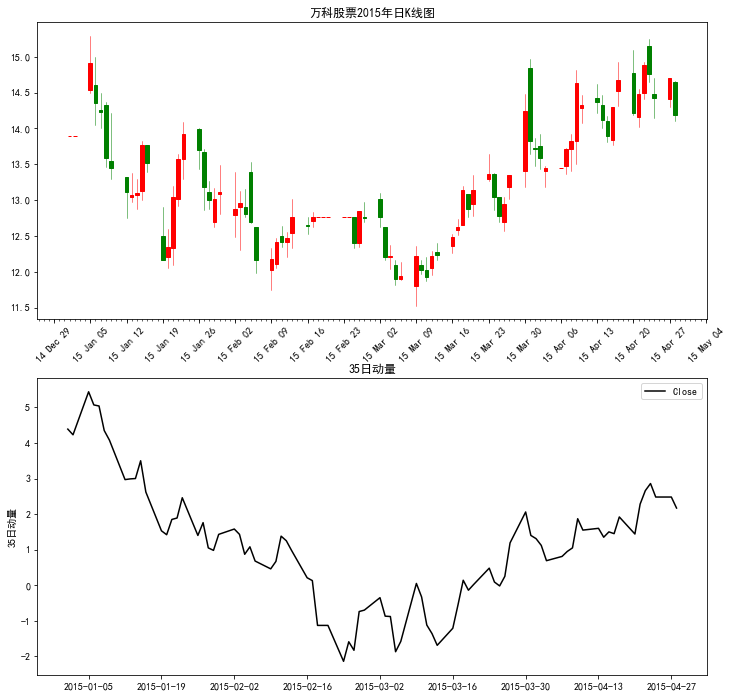 首先提取出万科股票的收盘价数据,计算35日动量值。
