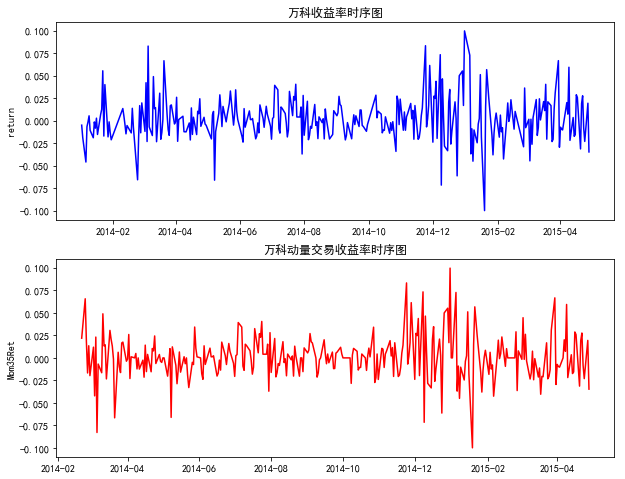 -----------------------绘制出万科股票收益率与动量指标交易策略收益率的时序图--------------------------