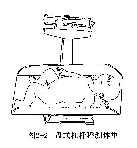 (4)测量方法 在晨起空腹排尿后或进食后2小时测量,脱去衣、帽、鞋、袜,只剩单衣、裤。小婴儿用盘式杆秤测量(图2-2),准确读数至10g;1~3岁小儿用坐式杠秤测量(图2-3),准确读数至50g;3岁以上用载重100kg的站式杠秤测量,准确读数不超过100g。测量过程中需注意保暖及安全。