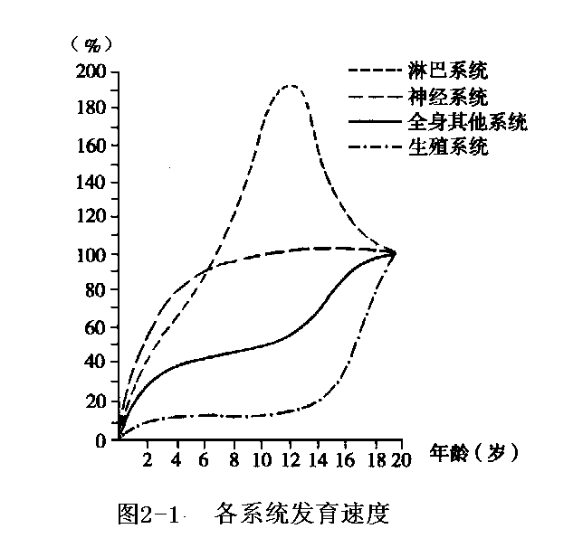 各系统的发育快慢不同,各有先后。神经系统发育最早;生殖系统发育最晚;淋巴系统则先快而后回缩;皮下脂肪发育在年幼时较发达;肌肉组织到学龄期才开始加速(图2-1)。