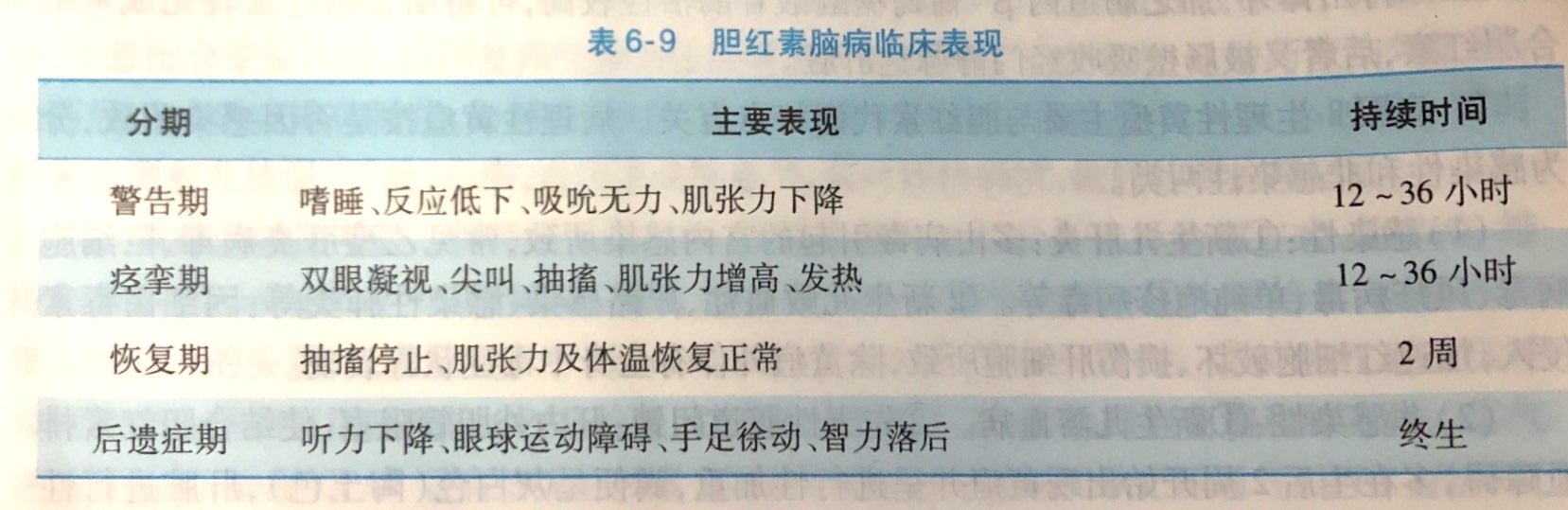 3)并发症:胆红素脑病(核黄宿)是新生儿溶血病最严重的并发症。当血清未结合胆红素浓度升高( >342mo/L即20mg/ dl),可通过血-脑屏障,引起神经系统损害,主要发生在生后2-7天,早产儿多见,典型临末表现包括警告期,痉挛期、恢复期及后遗症期(表6-9)