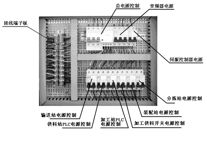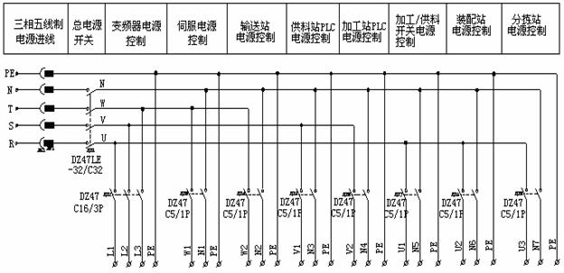 外部供电电源为三相五线制AC 380V/220V,图1-12为供电电源模块一次回路原理图。图中,总电源开关选用DZ47LE-32/C32型三相四线漏电开关。系统各主要负载通过自动开关单独供电。其中,变频器电源通过DZ47C16/3P三相自动开关供电;各工作站PLC均采用DZ47C5/2P单相自动开关供电。此外,系统配置4台DC24V6A开关稳压电源分别用作供料加工、装配、分拣及输送单元的直流电源。