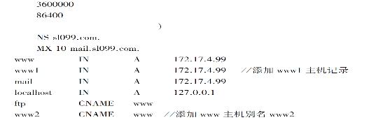 要建立非基于IP的虚拟主机,多个域名是不可少的配置,因为每个域名就对应一个要服务的虚拟主机。因此需要更改DNS服务器的配置,为服务器增加多个主机记录或者CNAME选项,编辑2.1学习情境的数据库文件/var/named/chroot/var/named/zone.exp: