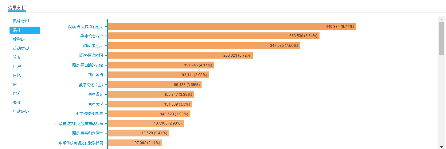 从整体课程的结果分析来看,小学学段的阅读课程《没头脑与不高兴》课程的学习量整体排名第一,数据高达449384次,初中学段的国家课程《初中英语》的学习量排名第一,数据高达183111次。高中学段中《数学文化(上)》的学习量排名第一,数据也达到169483次。