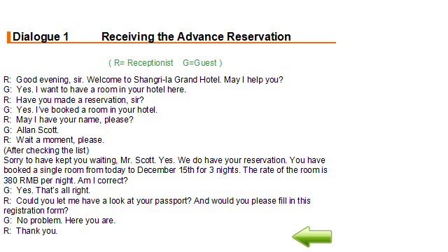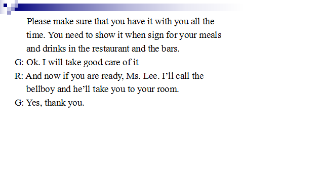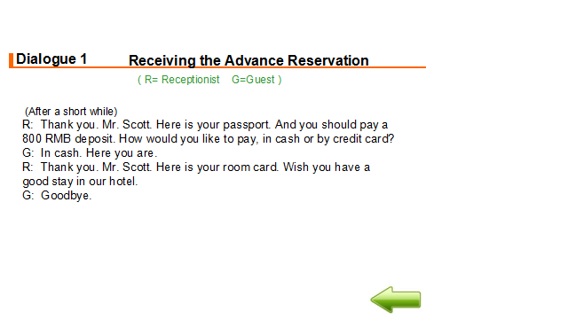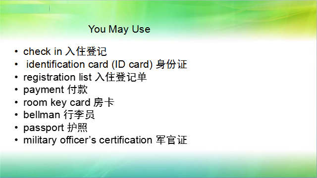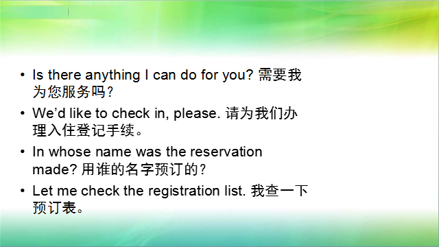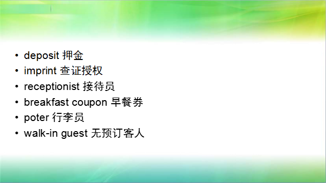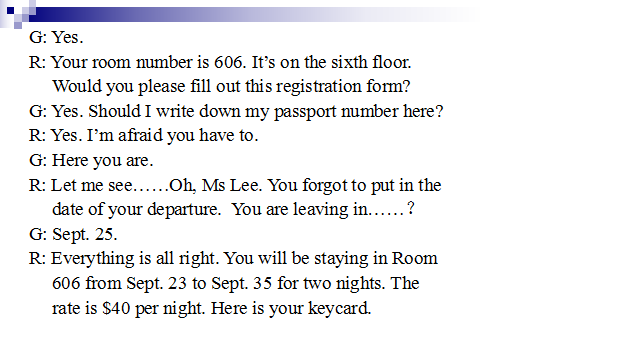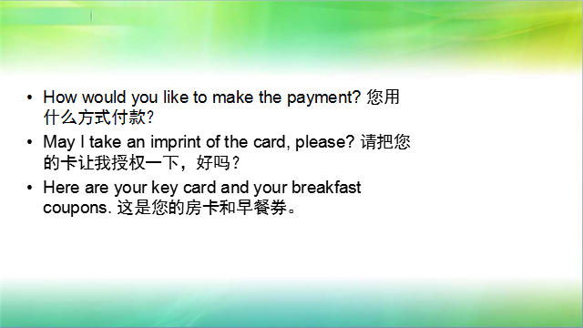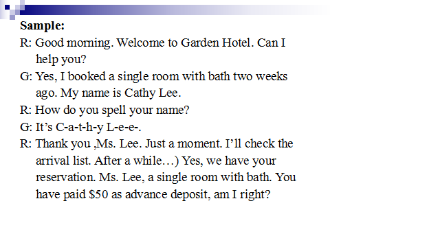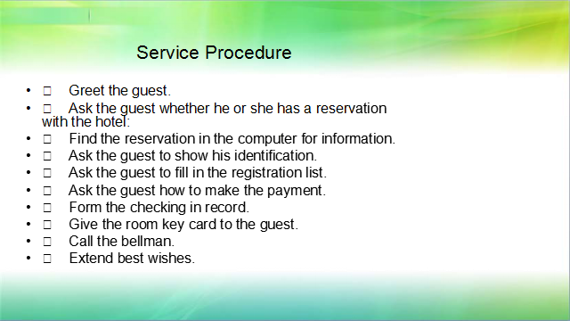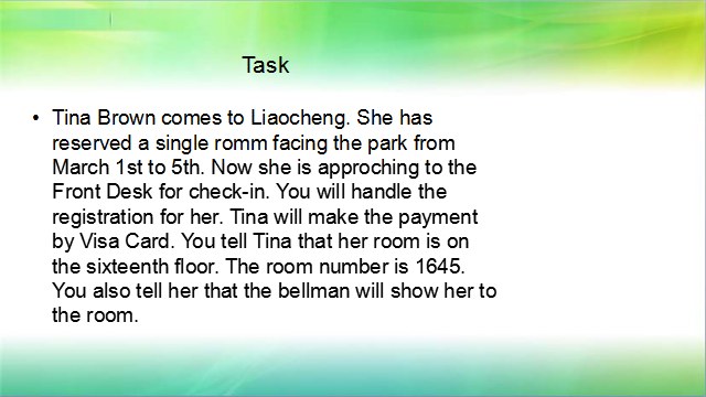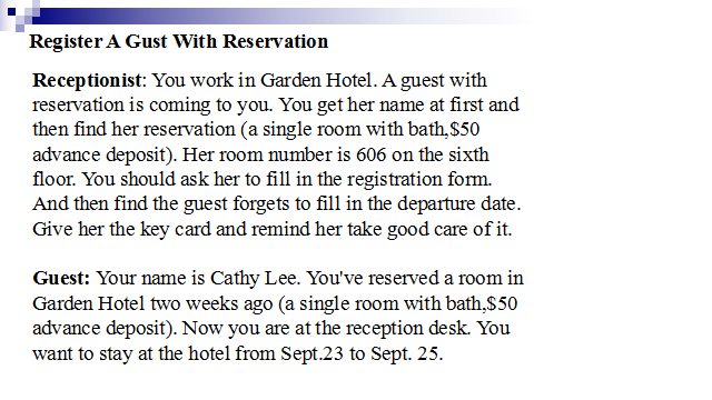 教学过程 1. 布置任务。 各小组现在为Arka酒店前厅服务人员。外籍客人 Tina来聊城旅游,她曾通过电话预订3月1日至5日的一个单人间,要求房间面向公园。她现在来到前台,办理入住登记手续。请接待她并为她办理入住登记。 2. 学生分组讨论 小组内讨论作为Arka酒店前厅服务人员在办理入住登记时应该注意什么?办理入住登记的工作流程是怎样的?办理入住登记时主要运用到哪些英语知识? 3. 展示 分小组展示讨论结果。 4. 学生互评、教师点评总结 Service Procedure 服务流程 Greet the guest. Ask the guest whether he or she has a reservation with the hotel Find the reservation in the computer for confirmation. Ask the guest to show his identification. Ask the guest to fill in the registration list. Ask the guest how to make the payment. Form the checking in record. Give the room key card to the guest. Call the bellman. Extend best wishes. 5. 教师布置口语训练任务 Tina Brown comes to Liaocheng. She has reserved a single room facing the park from March 1st to 5th. Now she is approaching to the Front Desk for check-in. You will handle the registration for her. Tina will make the payment by Visa Card. You tell Tina that her room is on the sixteenth floor. The room number is 1645. You also tell her that the bellman will show her to the room. Please make up a dialogue according to service procedure. Each group should make up a dialogue and make a role play. You need to pay attention to service skills, and you may use the following expressions: Is there anything I can do for you? 有什么可以为您效劳的吗? Do you have a reservation? 您有预订吗? In whose name was the reservation made? 您以谁的名义预订的? Let me check the registration list. 让我查看一下预订表。 May I see your passport? 我能看一下你的护照吗? Please fill in this registration form – your nationality, age, occupation, passport number, and your signature. 请在登记表上填上以下内容---国籍、年龄、职业、护照号码和你的签名。 How would you like to make your payment? 你打算如何付款? May I take an imprint of the card, please? 请让我授权一下卡片? I hope you will enjoy your stay here. 希望你过得愉快。 6. 学生分组讨论、编排对话并练习,将完成的对话呈现在工作页上 7. 分角色扮演,演示所编排对话 8. 学生互评、教师点评总结 示例对话 R: Receptionist G: Guest R:Good morning. Welcome to Arka Hotel. Is there anything I can do for you? G:I’d like to check in, please. R:Do you have a reservation? G:I have booked a single room for myself. R:In whose name was the reservation made? G:Tina Brown. R:Just a moment, please. Let me check the registration list. Thanks for waiting. You have a registration of a single room facing the park from March 1st to 5th, correct? G:That’s right. R:May I see your passport? G:Sure. Here you are. R:Thank you. Please fill in this registration form – your nationality, age, occupation, passport number, and your signature. G:Ok. Is that all right? R:Yes. Thanks. How would you like to make your payment? G:By Visa Card. R:May I take an imprint of the card, please? G:Certainly. R:Thank you, madam. Your room is 1645 on the sixteenth floor. Here are your key card and your breakfast coupons. G:Thank you. R:My pleasure. Just a minute, please. A bellman will show you to your room. I hope you will enjoy your stay here. 9. 记单词游戏、布置作业 教师将本课重点词汇、词组、句式以卡片形式呈现,由各小组进行抢答、计时测试等游戏,进行记忆。