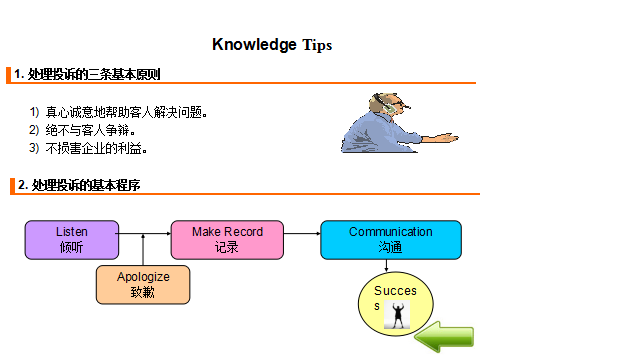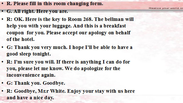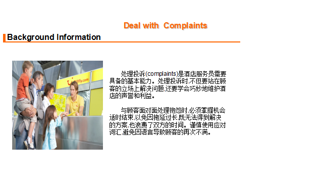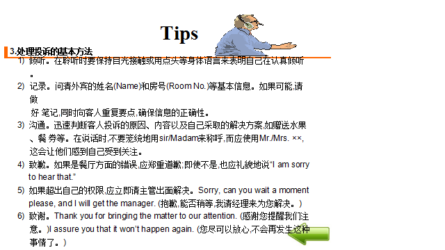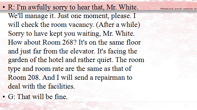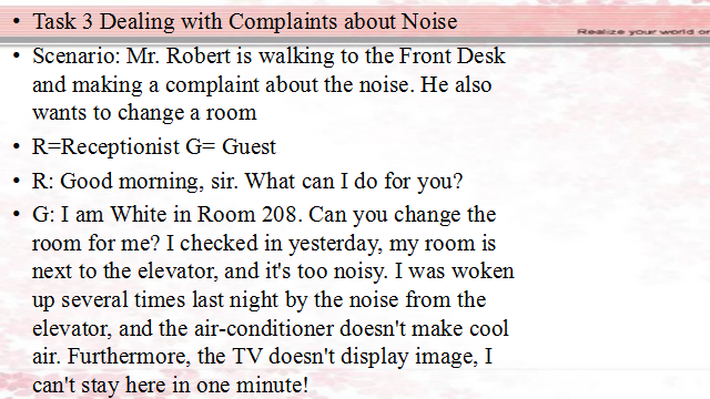教学过程 1. 布置任务。 各小组现在为Arka酒店前厅服务人员。1156号房的Smith先生打电话给前台的王平,因为抽水马桶不能用,空调也坏了,王平告诉他维修人员很快就到。他还将收到一个免费的花篮。 2. 学生分组讨论 小组内讨论作为Arka酒店前厅服务人员在处理投诉时应该注意什么?处理投诉的工作流程是怎样的?处理投诉时主要运用到哪些英语知识? 3. 展示 分小组展示讨论结果。 4. 学生互评、教师点评总结 Service Procedure 服务流程 Greet the guest. Use the polite language of service. Be patient to listen to what the guest says and take notes. Say “sorry” or make an apology to the guest. Tell the guest what will be done at once. Tell the guest the time in which the problem will be solved out. Ask the guest to tell his name and room number. Say “Thank you “ to the guest. Tell the related clerk to do at once. Exam the result and make a record. Express your wishes. 5. 教师布置口语训练任务 The lamp in Mr. Nobel’s room was broken. And no one solved the problems for him. He is very angry. Receptionist called Mr. Nobel to check the Maintenance service. 6. 学生分组讨论、编排对话并练习,将完成的对话呈现在工作页上 7. 分角色扮演,演示所编排对话 (R=Receptionist N= Mr. Nobel ) N: Hello. R: Good morning. Is that Mr. Nobel, Room 2049? N: Yes. Who is speaking, please? R: This is Reception, Mr. Nobel. You called us to report that there was something wrong with the lamps. N: Yes. I have never found a room with such poor facilities. R: I am awfully sorry about that. I am just calling to check whether the problems have been solved, Mr. Nobel. N: No, no one has come since I called you. R: I do apologize for that. I will check with the Maintenance Department. I assure you that they will come at once. N: Would you? Oh, here they come. Thank you. R: It is my pleasure. Thank you, Mr. Nobel. 8. 学生互评、教师点评总结 9. 记单词游戏、布置作业 教师将本课重点词汇、词组、句式以卡片形式呈现,由各小组进行抢答、计时测试等游戏,进行记忆。 | Explaining 10 minutes