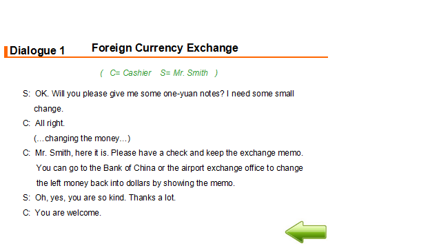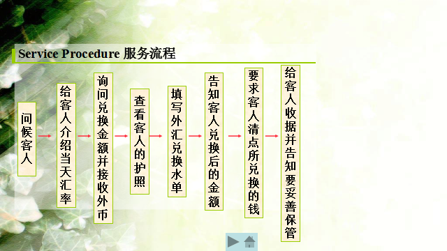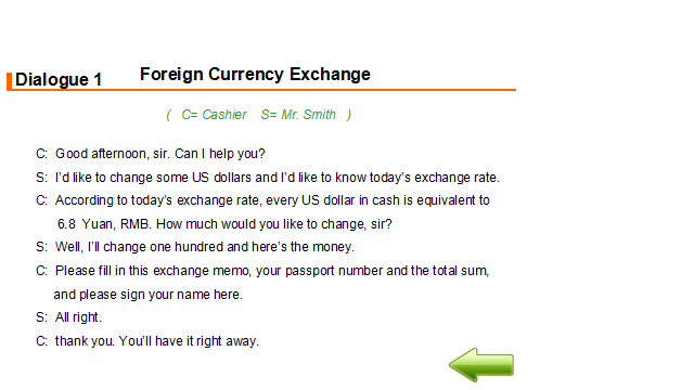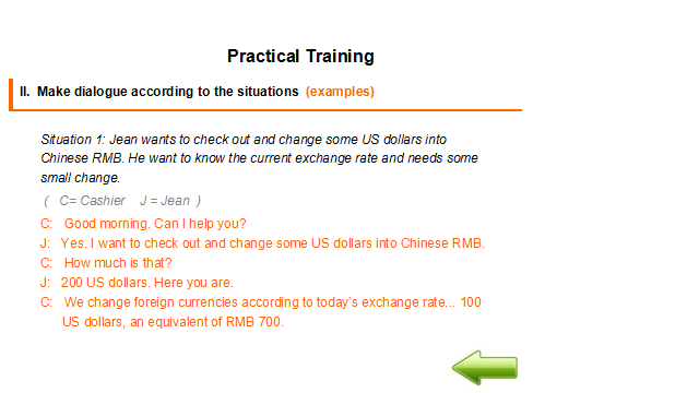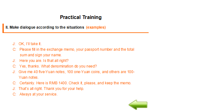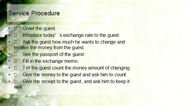 教学过程 1. 布置任务。 各小组现在为Arka酒店前厅服务人员。外籍客人Tina想换200美元的人民币买纪念品,现在她来到前台希望进行货币兑换,今天的汇率是100美元兑换人民币614RMB。你告诉Tina,按照今天的外汇汇率,200美元可以兑换人民币1228元。兑换完毕,你嘱咐Tina妥善保存外汇兑换水单,因为她回国时在海关需要出示它。Tina还想知道,她回国时怎样将剩下的人民币换回美元。你告诉她,可以在中国银行或机场外币兑换处换回美元,兑换时她还得出示这张水单。 2. 学生分组讨论 小组内讨论作为Arka酒店前厅服务人员在货币兑换时应该注意什么?货币兑换的工作流程是怎样的?接受货币兑换服务时主要运用到哪些英语知识? 3. 展示 分小组展示讨论结果。 4. 学生互评、教师点评总结 Service Procedure 服务流程 Greet the guest. Introduce today’s exchange rate to the guest. Ask the guest how much he wants to change and receive the money from the guest. See the passport of the guest. Fill in the exchange memo. Tell the guest about the money amount of changing. Give the money to the guest and ask him to count. Give the receipt to the guest, and ask him to keep it well. 5. 教师布置口语训练任务 A foreign guest named Tina Brown, who wants to change 200 dollars into RMB for some souvenirs. Today’s exchange rate: Every 100 dollars in cash comes to 614 RMB. You tell Tina that she changes foreign currencies according to today’s exchange rate, 200 dollars, and an equivalent of 1228 RMB. After exchanging, you urges her to keep this memo well because she is required to show it at the customs when she goes back to her country. Tina wonders how she can change his RMB left back into dollars when she goes back to her country. You tell her that she can change it back into dollars at the Bank of China or the Airport Exchange Office, and there she will be required to show the memo, too. You are a cashier. Please receive her and help her to changing dollars to RMB according to service procedure. Each group should make up a dialogue and make a role play. You need to pay attention to service skills, and you may use the following expressions: Is there anything I can do for you? 有什么需要为您效劳的吗? I’d like to change some dollars into Chinese RMB for Souvenirs. 我想将一些美元兑换成人民币购买纪念品。 At today’s rate of exchange, 100 dollars comes to 614 RMB. 根据今天的汇率,100美元可兑换614元人民币。 How much would you like to change? 你想兑换多少? Please fill in the exchange memo. 请填写兑换水单。 Be careful to fill in your passport number, the total, your room number or permanent address, and sign your name here as well. 请仔细填写你的护照号码,总数,你的房间号码或是永久地址,并签名。 What denominations would you like? 你需要什么面额的? Please count it. Here’s your memo. 清查一下。这是你的水单。 You’re required to show it at customs when you go back to your country. 当你回国时,你需要在海关出示它。 How can I change my remaining RMB back into dollars when I go back to my country? 在我回国时,我如何将剩余的人民币换回美元? You can change it back into dollars at the Bank of China or the Airport Exchange Office. 你可以在中国银行或者机场外币兑换处将人民币换成美元。 6. 学生分组讨论、编排对话并练习,将完成的对话呈现在工作页上 7. 分角色扮演,演示所编排对话 C: Cahier G: Guest C: Good morning. Is there anything I can do for you? G: I’d like to change some dollars into Chinese RMB for Souvenirs. C: At today’s rate of exchange, 100 dollars comes to 614 RMB. How much would you like to change, Madam? G: Two hundred dollars. Here you are. C: Two hundred dollars. The exchange rate is 614 RMB. May I use your passport, madam? G: Sure. Here you are. C: Please fill in the exchange memo. Be careful to fill in your passport number, the total, your room number or permanent address, and sign your name here as well. G: Here you are. Is that all right? C: That’s all right. Thanks. What denominations would you like? G: Any kind will be OK. C: Here is 1228 RMB. Please count it. Here is your memo. Please hold on to it. You’re required to show it at customs when you go back to your country. G: No problem. By the way, how can I change my remaining RMB back into dollars when I go back to my country? C: You can change it back into dollars at the Bank of China or the Airport Exchange Office, and you’ll be required to show the memo there, too. G: Thanks for your help. C: You’re welcome. Glad to have served you. 8. 学生互评、教师点评总结 9. 记单词游戏、布置作业 教师将本课重点词汇、词组、句式以卡片形式呈现,由各小组进行抢答、计时测试等游戏,进行记忆。 | Explaining 10 minutes