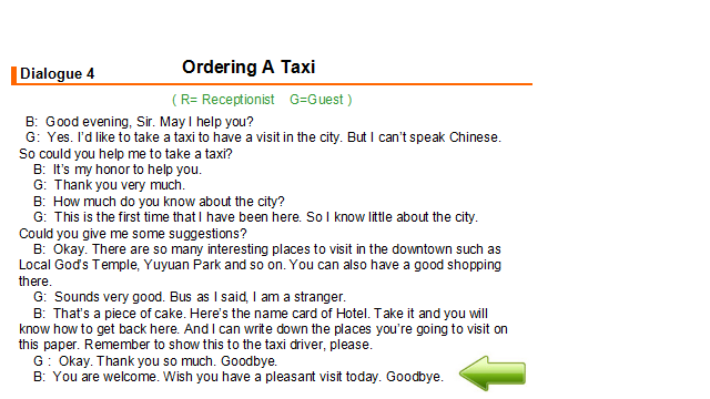 Mrs Rose Brown needs to call a taxi, because she plans to visit the Summer Palace in the morning and the Great Wall in the afternoon. She wants to get some advice on how to rent a taxi from Zhou Tao...