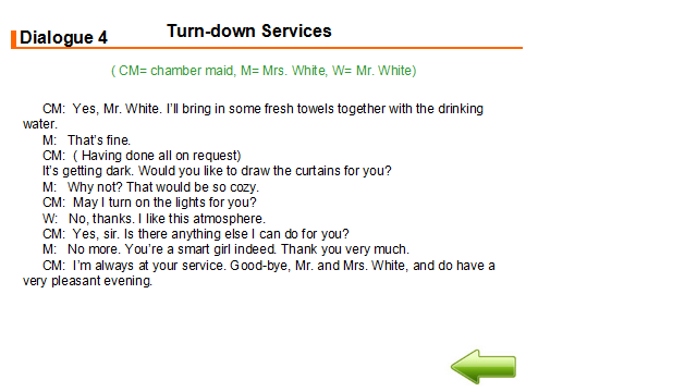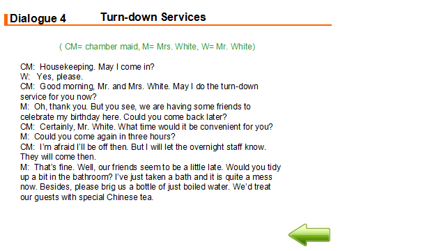 Brown: Oh, I see. Please come back to turn down the bed at 10: 15. Could you clean the bathroom now? I just had a bath and the bathroom is in disarray. My former classmates will be here shortly.