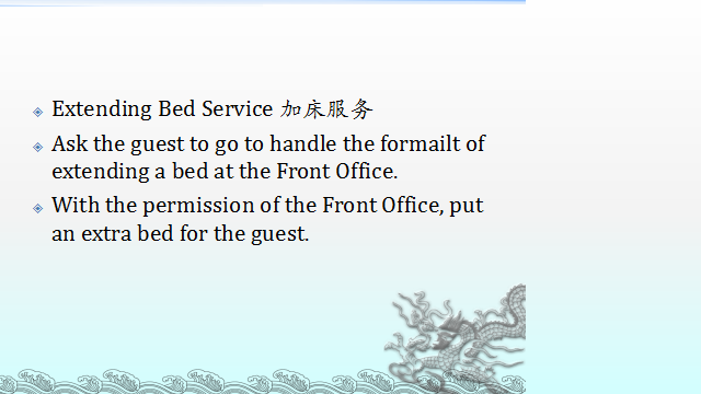 With the permission of the Front Office, Wang Li will bring in the extended bed whenshe comes back for turning down the bed.