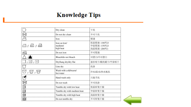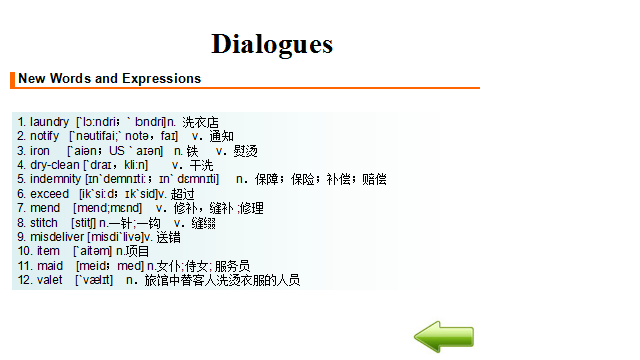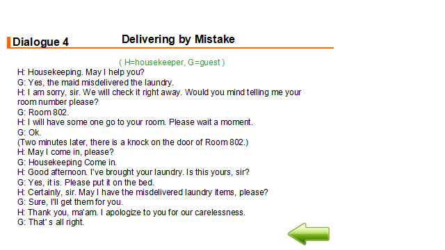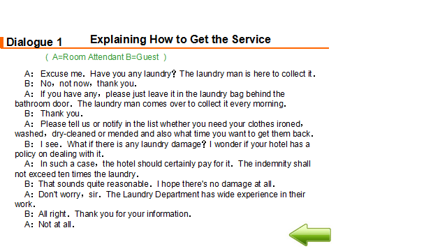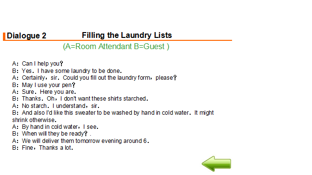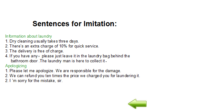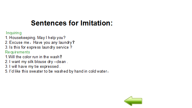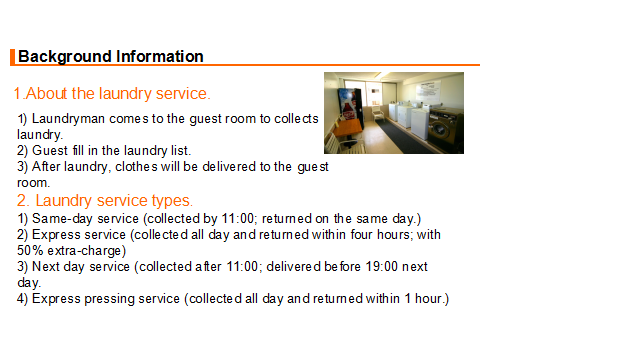 教学过程 1. 布置任务。 各小组现在为Arka酒店洗衣部服务人员。布莱克先生向你询问酒店是否有洗衣服务。你回答是的,并向他介绍酒店的洗衣服务。布莱克先生的毛衣上面有个小洞。他希望能够修补一下。酒店可以修补,但是要在洗衣单中注明。布莱克先生还有一套西装需要熨烫。另外,布莱克先生还想清洗皮衣,但是酒店没有特殊的设备。 2. 学生分组讨论 小组内讨论作为Arka酒店洗衣部服务人员在为客人介绍洗衣服务时应该注意什么?洗衣服务工作流程是怎样的?介绍洗衣服务时主要运用到哪些英语知识? 3. 展示 分小组展示讨论结果。 4. 学生互评、教师点评总结 Service Procedure 服务流程 Come to the guest room to collects laundry. Greet the guest. Ask the guest fill in the laundry list. Check the form. The room number; The name of the guest; The special demands of the guest. Collect the laundry and check the clothes. Deliver laundry to the guest room after laundry. 5. 教师布置口语训练任务 Mr. Black asks you if there is laundry service in the hotel. You answer “yes” and introduce to him the laundry service in the hotel. There is a hole in the sweater. He wants to deal with it. The hotel can deal with it, but this kind of special demand should be written clearly in the laundry list. Mr. Black has a set of suit, and he wants it pressed only. Mr. Black wants his leather coat to be cleaned, but the hotel has no special equipment. Please introduce laundry service of the hotel to Mr. Black. Each group should make up a dialogue and make a role play. You need to pay attention to service skills, and you may use the following expressions: laundry service 洗衣服务 same day service 普通洗衣服务 express/quick service 快洗服务 laundry list洗衣单 ironing/pressing 熨烫 washing 水洗 dry-cleaning 干洗 mending 织补 laundry bag 洗衣袋 sweater 毛衣 leather coat 皮衣 hand wash 手洗 rate list价目单 pressing only 单烫 machine wash 机洗 extra charge 附加费 date sent送洗日期 dress 连衣裙 overcoat/long coat 大衣 scarf 围巾 suit 西装 skirt 短裙 shirt衬衣 acket 短上衣,夹克 waist coat 背心,马甲 If you have any laundry, please leave it in the laundry bag behind the bathroom door. 如果日您有要洗的衣物,请房子浴室门后的洗衣袋里。 Please note on the laundry list whether you need your clothes ironed, washed, or dry-cleaned and what time you want to get them back. 请在洗衣单上注明您的衣服是需要熨烫,水洗还是干洗,还要注明何时需要取衣服。 I’m sorry, but we don’t have the special equipment to clean leather. 很抱歉,我们没有清洗皮料所需要的特殊设备。 6. 学生分组讨论、编排对话并练习,将完成的对话呈现在工作页上 7. 分角色扮演,演示所编排对话 8. 学生互评、教师点评总结 示例对话 L: Laundryman G: Guest L: Good morning. Housekeeping. How can I help you? G: Do you have laundry service? L: Yes, we have. If you have any laundry, please leave it in the laundry bag behind the bathroom door.Please note on the laundry list whether you need your clothes ironed, washed, or dry-cleaned and what time you want to get them back. G: There is a hole in my sweater. I wonder if you can deal with it. L: Certainly, we can. Please note that on the laundry list, too. G: I have to attend a meeting tomorrow. Could you have my suit pressed only? L: Of course. Is there anything else we can do for you? G: My leather coat needs cleaning. L: I’m sorry, but we don’t have the special equipment to clean leather. G: Thank you for your information. 9. 记单词游戏、布置作业 教师将本课重点词汇、词组、句式以卡片形式呈现,由各小组进行抢答、计时测试等游戏,进行记忆。 | Explaining 10 minutes