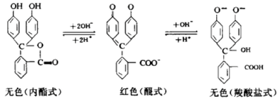 酚酞是4,4-二羟基三苯甲醇-2-羧酸的内酯,无色,不溶于水,溶于有机溶剂。遇碱时,内酯开环而生成二钠盐,发生重排,形成醌式结构而呈玫瑰红色, 醌基是显色基团(红),但在强碱溶液中不稳定而形成无色的三钠盐。其反应如下: