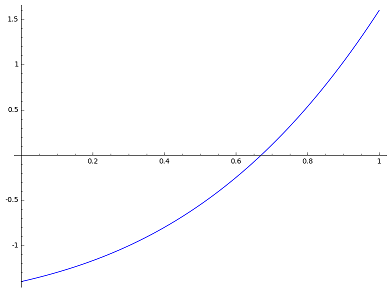 解 注意到 $ f(0)f(1) <0 $ 故函数 $f(x)=x^3 +1.1x^2 +0.9x-1.4$在[0,1]中有根;又因为$f^{'}(x)=3x^2+2.2x+0.9 > 0 $,因此函数 $f$ 在[0,1]中仅有一个零点(也可用fplot 命令显示f(x)的图形得此结论),适合用二分法求根.