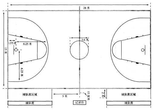 国际篮联规定的正式比赛的球场称为标准场地,是一个长28米、宽15米的长方形,球场的丈量从界线的内沿量起。根据2004年篮球竞赛规则,对于所有其他比赛,国际篮联的适当部门,如地区委员会或国家联合会,有权批准的最小尺寸为长26米、宽14米的现存球场。所有新建球场的尺寸都要与国际篮联正式比赛所规定的要求一致。正式球场的全部尺寸如图1。