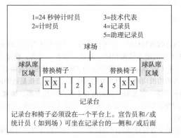 记录台位于球队席同侧边线外的中央,替补队员席应位于记录台前,注意其座椅不可挡住记录台人员观察全场的视线。记录台和替补队员席见图4。