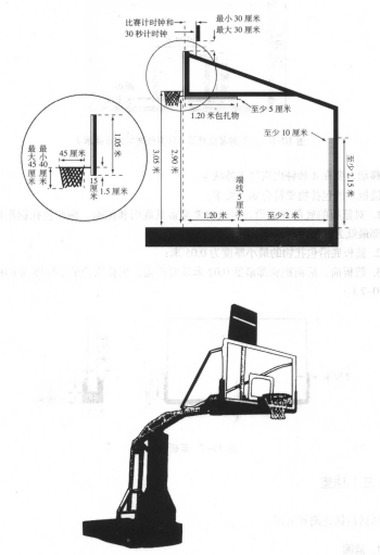 篮球架可用金属或木料制作,立于场外,有固定和移动的两种(如图5),都必须把篮球架牢固地固结在地板上。