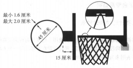 篮圈要用实心钢材制成,内径最小为0.45米,最大为0.475米,漆成橙色。圈材的直径最小为0.016米,最大为0.020米,圈的下沿设有系篮网的附加系统。把篮网系在篮圈上的系统必须是没有尖锐的角或容得手指进入的空间(间隙)。篮圈应安装在支撑篮板的构架上,篮圈顶面要成水平,距地面3.05米,与篮板两垂直边的距离相等。篮板正面距离篮圈内沿的最近点为0.15米(如图8)。