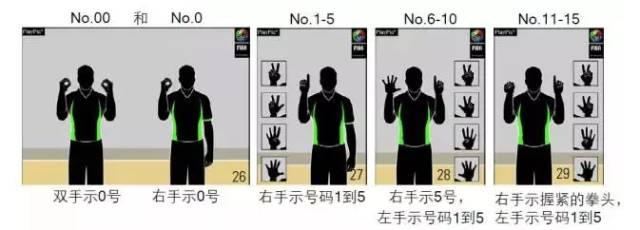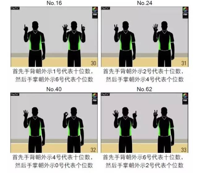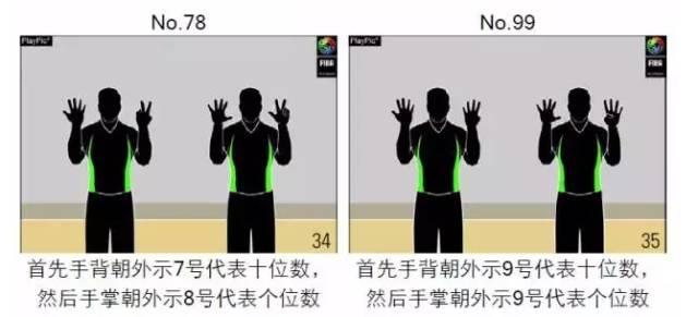 FIBA现在允许使用0 , 00和1 ~ 99的号码。球员可以通过裁判手势来确认犯规登记在谁的身上。