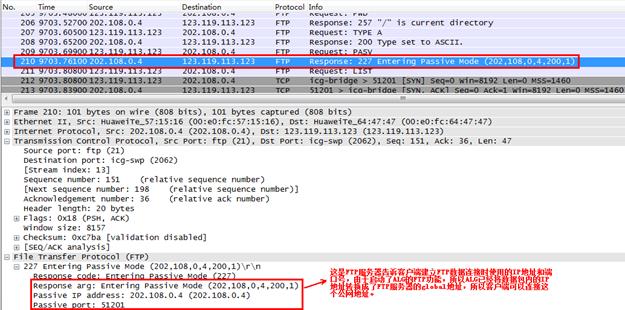 图6 PASV模式、开启ALG下服务器发回的PASV响应报文