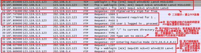 客户端向服务器发送PORT命令,通知服务器开启PORT被动模式,并告诉服务器连接IP地址是123.119.113.123,端口号是2065=8×256+17。随后客户端开始在该地址和端口监听,等待服务器主动连接自己。