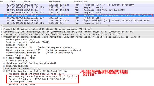 客户端向服务器发送PASV命令,通知服务器开启PASV被动模式,服务器开启PASV模式后,会在发送给客户端的PASV响应报文中携带自己的私网地址和端口号(172.16.0.4,2049),告诉客户端连接自己的这个地址和端口号,随后服务器开始在该地址和端口监听,等待客户端连接自己。由于没有启动ALG功能,所以在经过内网网关的时候,PASV响应报文中的地址和端口号不变,仍然是私网地址和端口号。