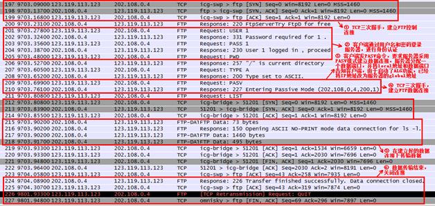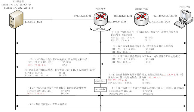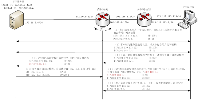 客户端随机选择一个空闲端口4302,连接服务器地址和端口号(202.108.0.4,51201),由于这是公网地址,沿途路由器可以找到目的地址,数据包到达内网网关路由器的时候,由NAT协议将公网地址和端口号(202.108.0.4,51201)转换为私网地址和端口号(172.16.0.4,2049),继而找到FTP服务器,通过TCP三次握手建立FTP数据连接,客户端和服务器之间通过数据通道来进行数据传输。
