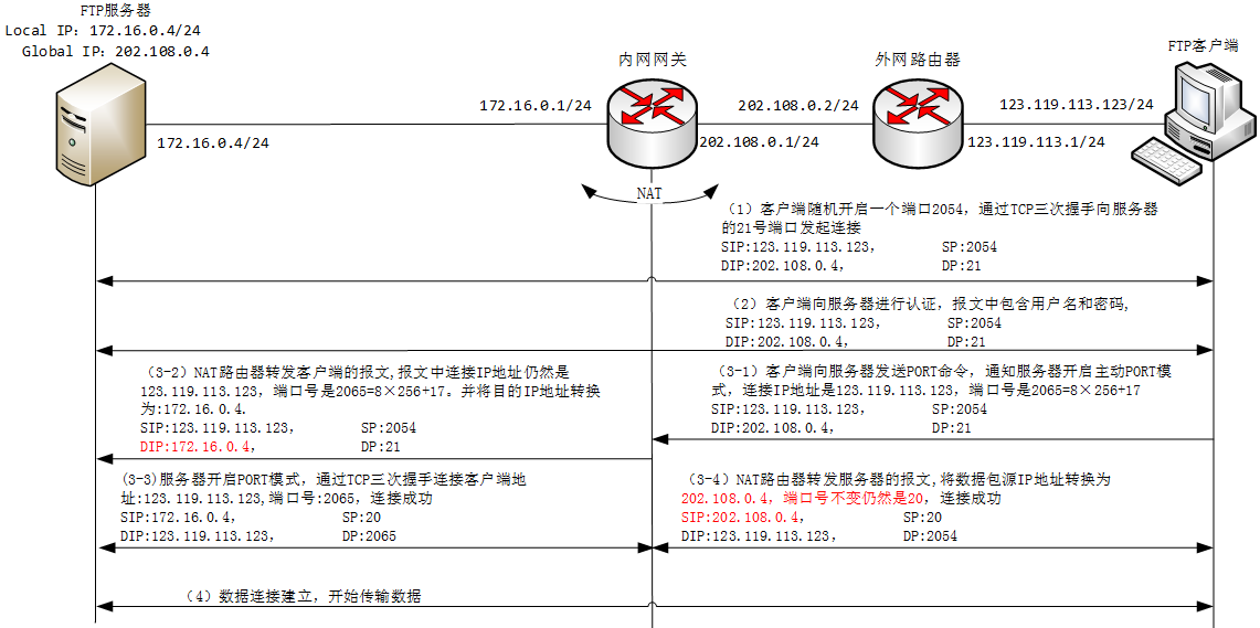 服务器开启PORT模式后,使用自己的私网地址和FTP公认的数据端口号(172.16.0.4,20),连接客户端地址和端口号(123.119.113.123,2065),由于这是公网地址,沿途路由器可以找到目的地址,数据包到达内网网关路由器的时候,由NAT协议将源地址和端口号(172.16.0.4,20)转换为公网地址和端口号(202.108.0.4,20),继而找到客户端主机,并通过TCP三次握手建立FTP数据连接,客户端和服务器之间通过数据通道来进行数据传输。