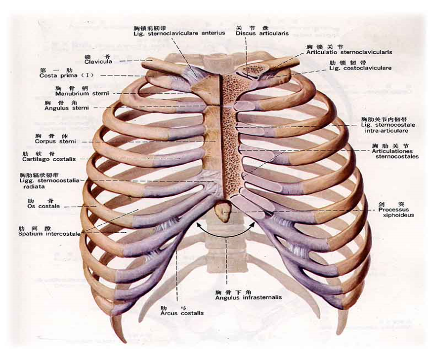 (3)胸廓为组成:胸椎12块,胸骨1块,肋12对