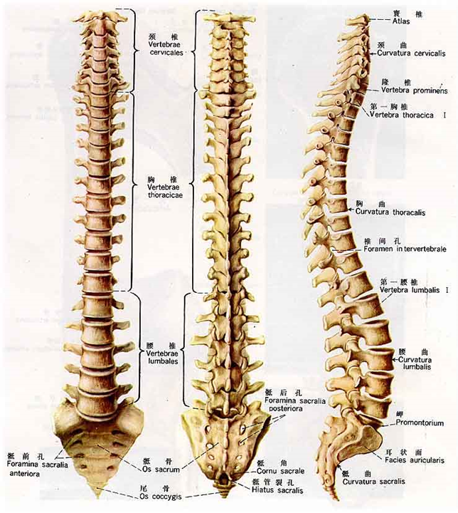 ①脊柱组成:颈椎7块,胸椎12块,腰椎5块,骶椎骨一块,尾椎一块。