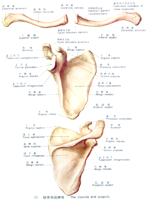 肩胛骨:三角形的扁骨,位于背部上方,胸廓后外侧,介于2~7肋骨之间,有两面,三缘和三角。