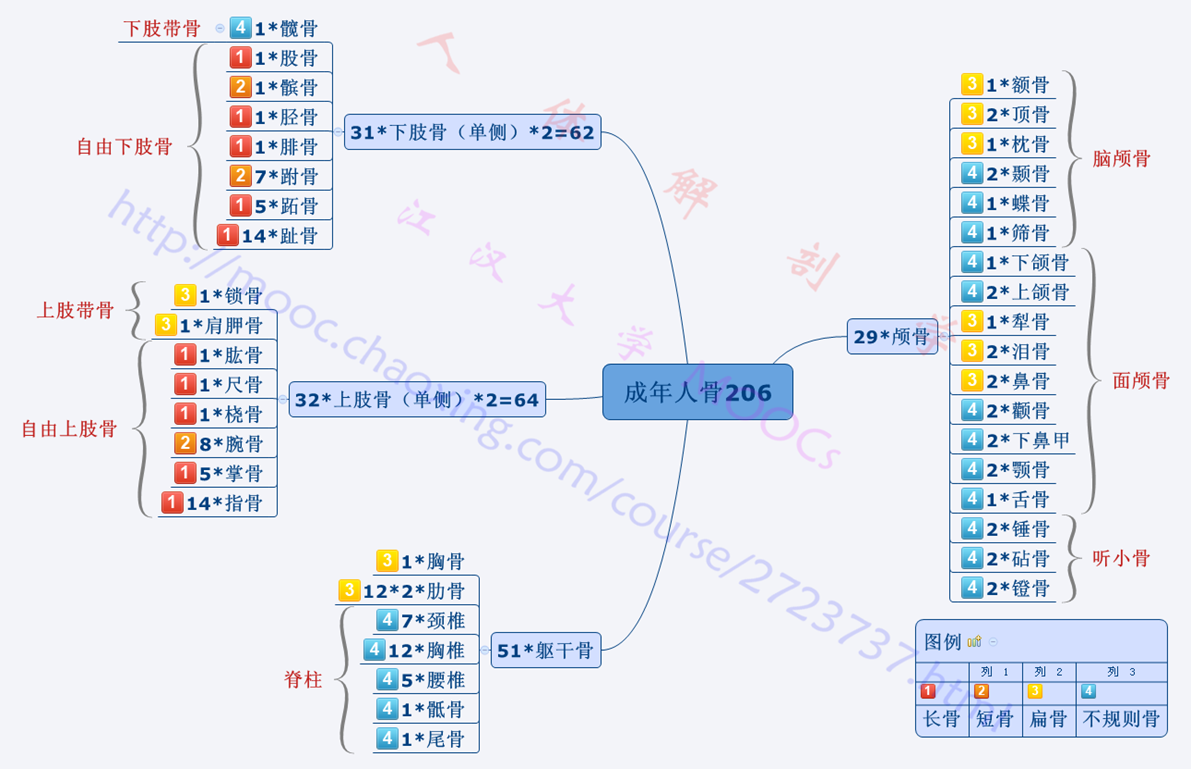 (3)骨按的人体分部分:颅骨,躯干骨,上肢骨,下肢骨。