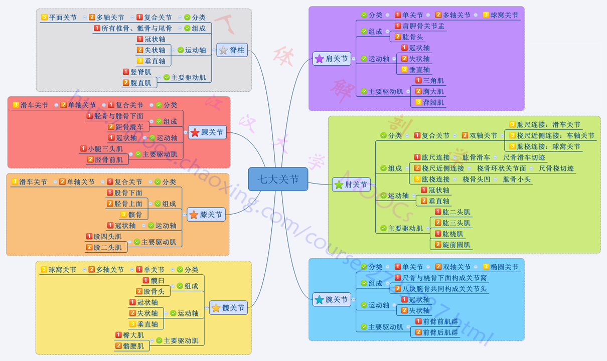 ①肩关节:肩胛骨外侧较肥厚,有朝向外侧的关节面,称关节盂,与肱骨头相关节。②肘关节:由肱骨下端和尺骨、桡骨上端构成,包括三个关节,即肱尺关节、肱桡关节和桡尺近侧关节。③腕关节:由手的舟骨、月骨和三角骨的近侧关节面作为关节头,桡骨的腕关节面和尺骨头下方的关节盘作为关节窝而构成。