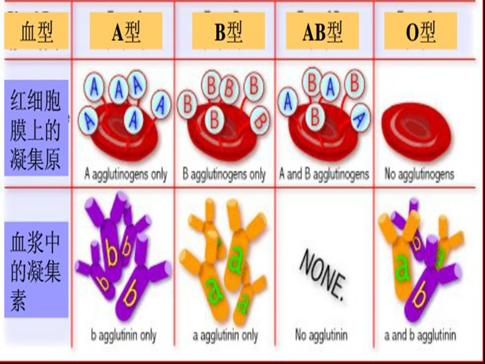 ④O型::红细胞上既不含A抗原,也没有B抗原;血浆中有抗A、抗B抗体。