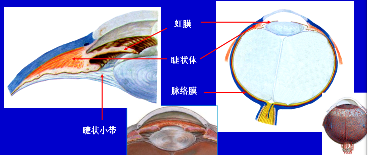 ②房水循环:房水由睫状体产生,从后房经瞳孔流入前房,再经虹膜角膜角渗入巩膜静脉窦最后汇入眼静脉。当房水循环受阻时可引起眼内压升高致青光眼。