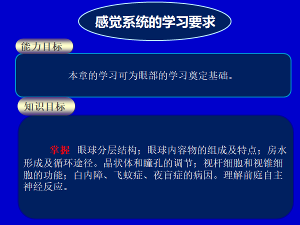 C.视网膜:分为视部和盲部Ø视锥细胞能感受强光和辨色;Ø视杆细胞仅能感受弱光,不能辨色。