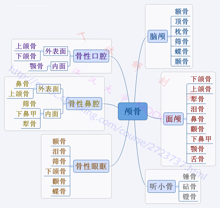 脑颅骨:成对的:顶骨,颞骨,不成对的:额骨,筛骨,蝶骨,枕骨。